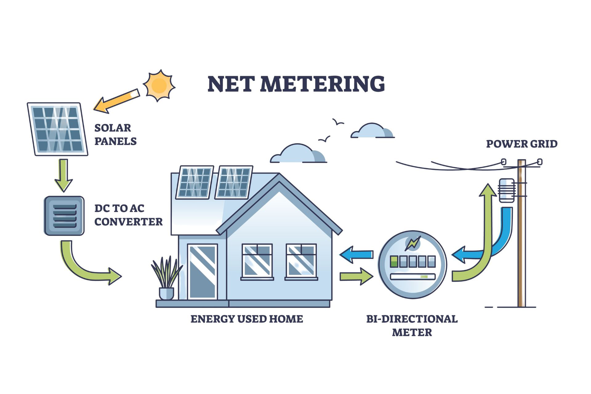 Net metering has less to do with solar panels’ function and more to do with financial savings. It’s a billing mechanism that allows solar panel users to receive credits for the excess energy their systems produce and send back to the grid.